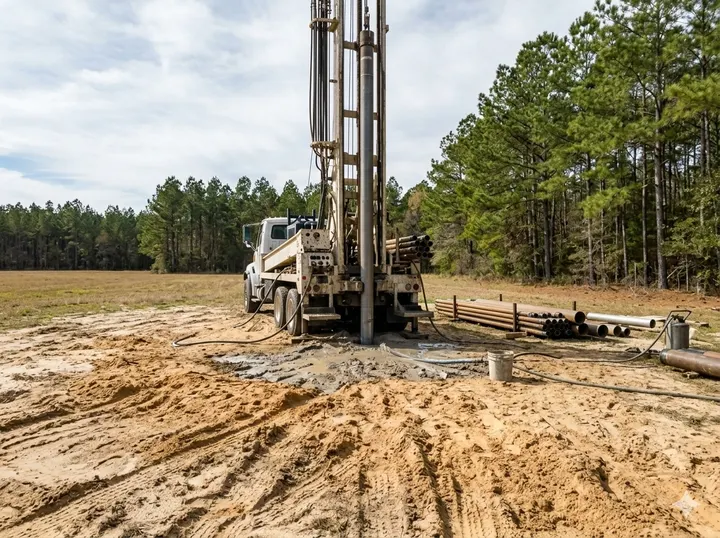 Wayne County sits atop the Floridan Aquifer System — one of the most productive confined aquifer systems in the world. Residential wells in the Jesup area typically penetrate 200 to 500 feet to reach the Upper Floridan Aquifer, where yields of 5 to 20 gallons per minute are standard for household use. The aquifer's limestone and dolomite formation provides naturally filtered water, though mineral content — particularly iron and hydrogen sulfide — varies by location and depth. We reference local well logs filed with Georgia EPD before selecting a target drilling depth for your property.